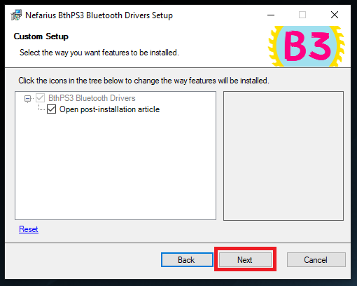 - The next screen shows what drivers will be installed. The "BthPS3 Bluetooth Drivers" and "Open post-installation article" options are selected by default. Leave those checked and click "Next".