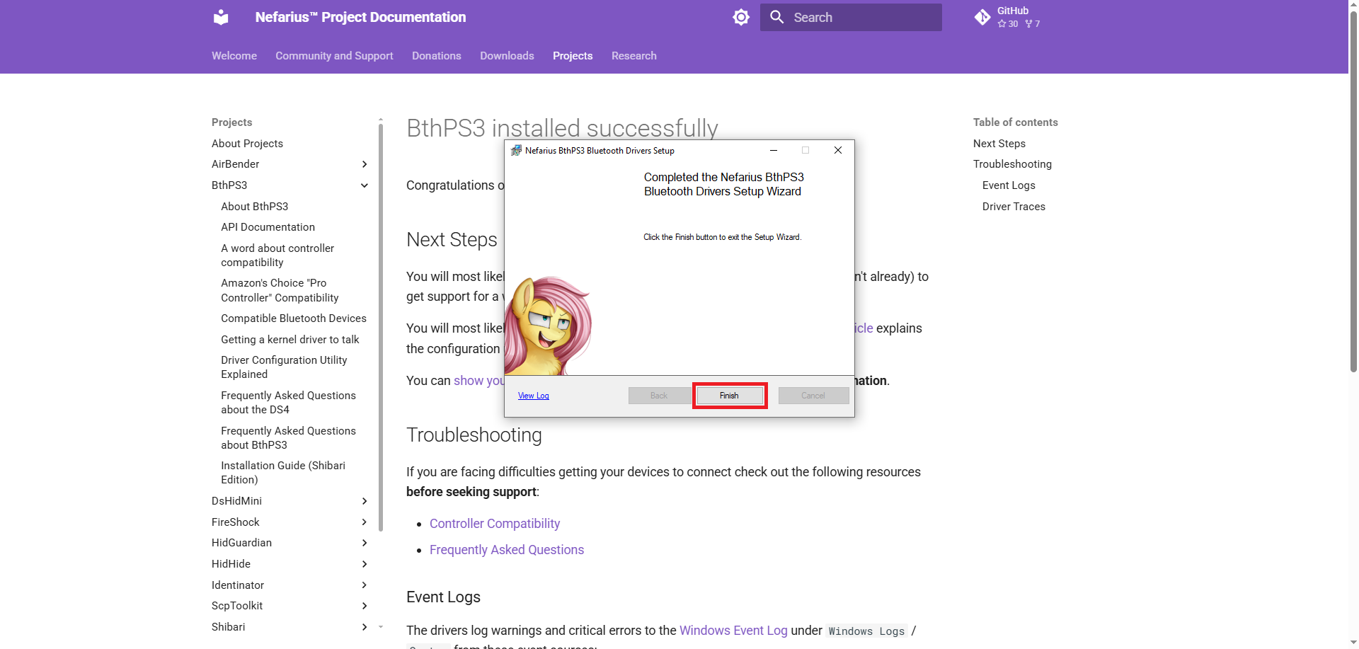 - After the BthPS3 Drivers have been installed, a webpage will open with important information. Please read through it. When done, click "Finish" to close the wizard. You can now restart your computer.