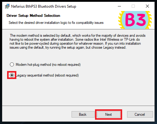 - The next screen asks if you want to use the "Modern hot-plug" or "Legacy sequential" method to install the drivers. The modern method does not require you to restart your computer but does not work for all Bluetooth receivers. The legacy method should always work but requires you to restart your computer afterward. Choose the option that fits your setup, then click "Next".