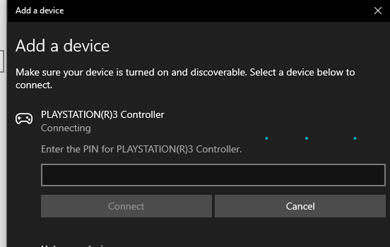 Do not attempt to pair a PS3 controller on Windows via the built-in device discovery dialog, like:
