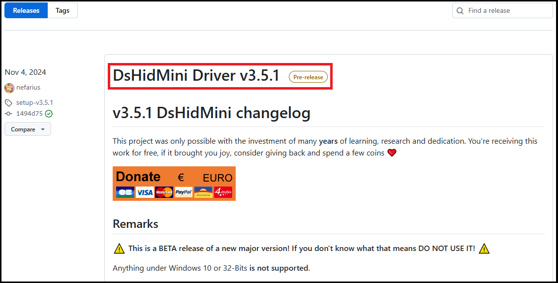 - Download and install DsHidMini Version 3 Driver by downloading the latest release marked as Pre-release or any version labeled v3.x.x